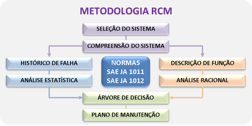 A empresa deve se estruturar e se organizar para dar respostas robustas à estas questões, bem como se antecipar às mesmas. Na Figura abaixo temos a metodologia de implantação do RCM, orientados pelas Normas SAE JA 1011 e SAE JA 1012. Ressalta-se que as etapas não necessariamente são feitas na sequência detalhada.