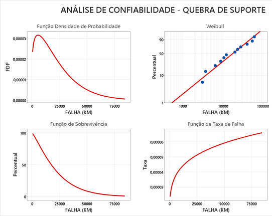 Existem diversos softwares estatísticos que podem ser utilizados em estudos de confiabilidade. Em nosso caso utilizamos os Minitab, conforme exemplo na Figura abaixo sobre a quebra de um suporte.